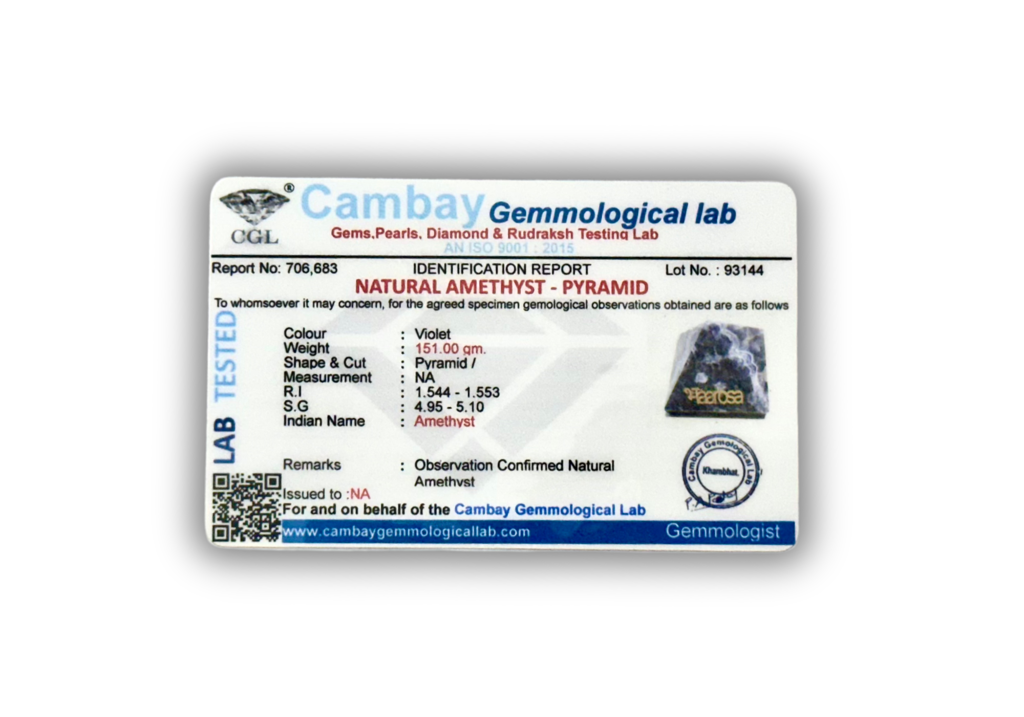 The Bhaarosa Amethyst Pyramid comes with its own lab testing certificate for the authenticity of the crystal used.
